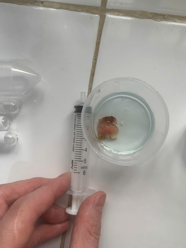 Trong quá trình nội soi, phát hiện dị vật kích thước khoảng 2x2 cm gây bít tắc gần hoàn toàn khẩu kính phế quản gốc phải. Với kinh nghiệm chuyên môn trong nội soi phế quản ống mềm, sự phối hợp nhịp nhàng của kíp thực hiện kỹ thuật đã được gắp thành công dị vật (răng giả) và bơm rửa sạch lòng phế quản. Trong quá trình can thiệp gắp dị vật an toàn, không xảy ra biến chứng.