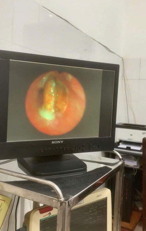 Người bệnh ho kéo dài trên 1 tháng nay, đã được điều trị kháng sinh tại ở cơ sở y tế khác nhưng tình trạng ho thành cơn, tức ngực, khó thở ngày càng tăng, được chuyển đến Bệnh viện Phổi điều trị với chẩn đoán Viêm phổi - Apxe phổi phải/ Đái tháo đường typ II. Khi tiếp nhận các bác sĩ Khoa Khám bệnh - Hồi Sức cấp cứu khẩn trương thăm khám lâm sàng, đánh giá tình trạng nhiễm khuẩn, chỉ định các cận lâm sàng cần thiết cho người bệnh. Qua hình ảnh chụp CT-scan lồng ngực, các bác sĩ nhận thấy có tổn thương nghi có dị vật đường thở tại phế quản gốc phải và tổn thương viêm phổi áp-xe phổi tại thùy giữa phổi phải, các bác sĩ đã hội chẩn, qua đó chỉ định nội soi phế quản ống mềm để can thiệp và lấy bệnh phẩm xét nghiệm.